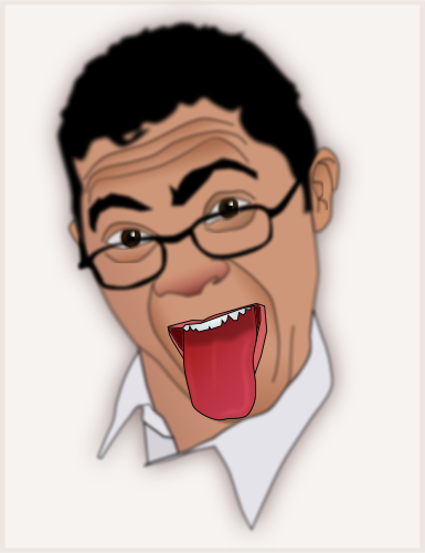 This features a man with glasses and a white shirt, making a funny face. He has his tongue sticking out of his mouth, giving the impression that he is playfully licking his lips. His facial expression appears to be humorous and exaggerated, likely meant for entertainment or amusement. The man's glasses are placed on top of his head, adding to the lighthearted nature of the scene.