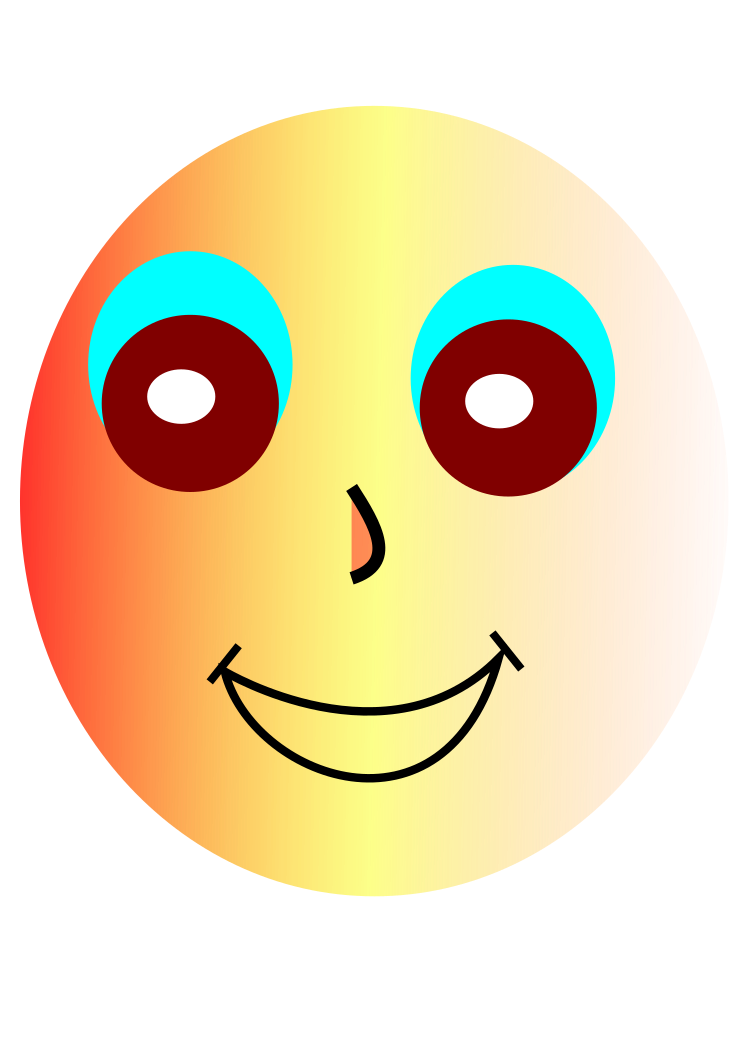 This features a smiley, happy face with gradient colors. It is a round, yellow and orange circle with blue eyes and a smile on its face. The color scheme of the face includes yellow in the center, orange around the edges, and blue for the eyes. This cheerful design gives off a positive vibe and can be used to convey happiness or friendliness.