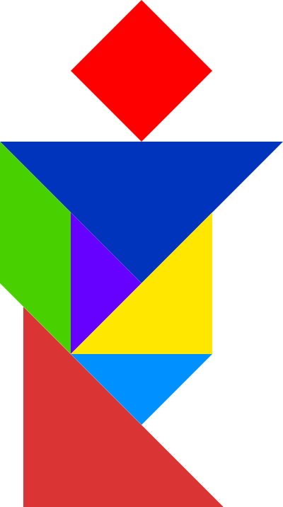 This features a colorful tangram puzzle, which is made up of various geometric shapes. These shapes are arranged in such a way that they form a human-like shape. The background of the image is white, providing a clean and uncluttered appearance to the puzzle. The tangram puzzle is visually appealing and demonstrates the creativity involved in its design.