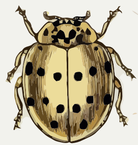 This features a close-up of a yellow and black bug with polka dots. It appears to be an illustration or drawing, possibly from an old book, as it has been hand edited. The bug is prominently displayed in the center of the image, occupying most of the frame. Its distinctive pattern of spots and lines makes it stand out against the background.