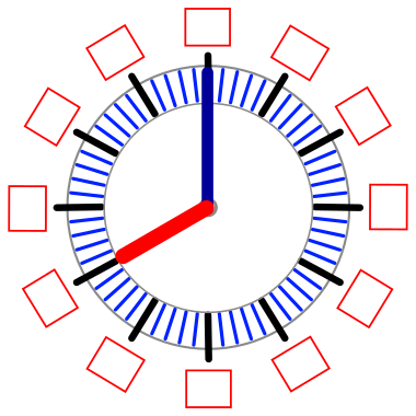 This features a large, round clock with blue and red numbers. It is placed in the center of the scene, surrounded by several smaller circles that are arranged around it. These smaller circles appear to be part of a larger circle or template, possibly used for learning time or as an educational tool. The clock's design makes it easy to read and understand, making it suitable for use in various settings.