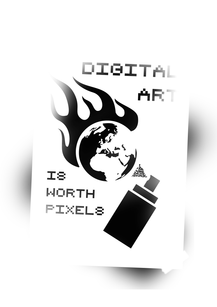 This features a poster with the phrase "Digital art is worth pixels" written on it. The poster also includes an illustration of a spray paint can, which adds to the theme of digital art. The background of the poster has a blurry appearance, giving it a slightly out-of-focus look. Overall, the image conveys the idea that digital art is valuable and should be appreciated for its composition and creativity.