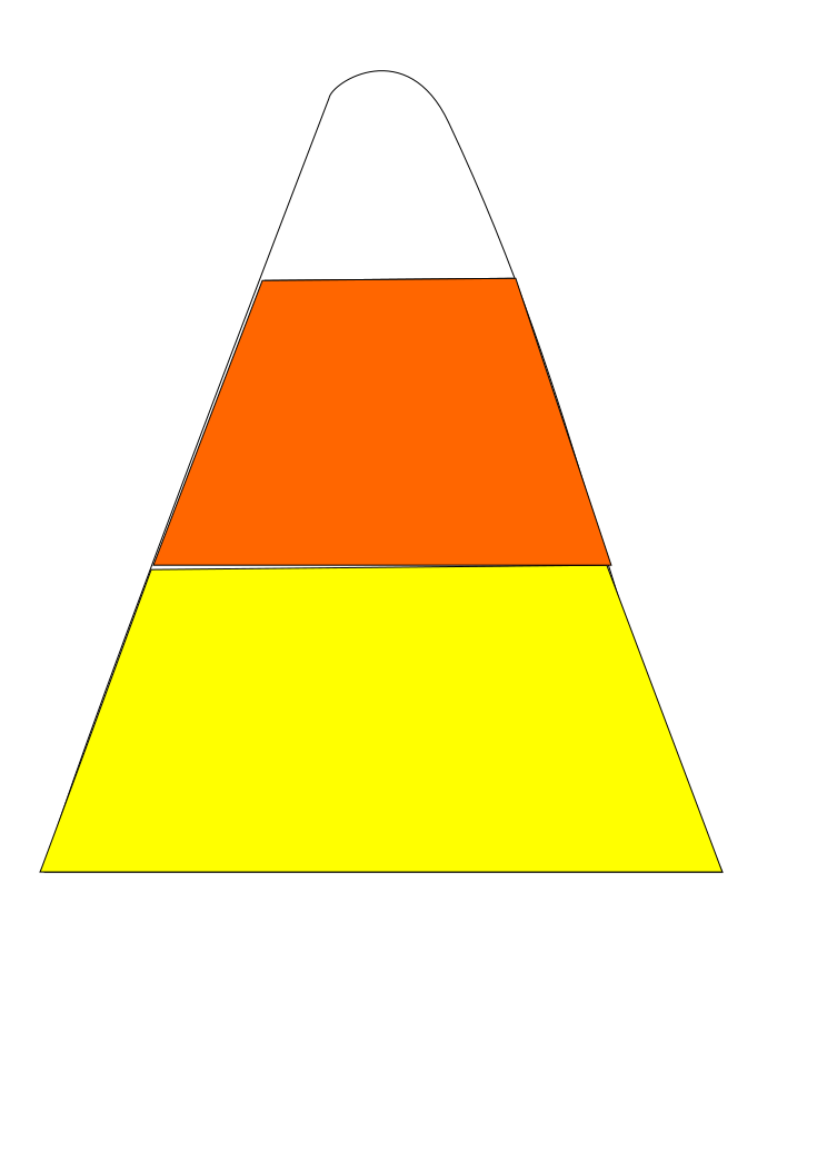 This features a large, three-dimensional triangle made up of yellow, orange, and white colors. It is shaped like a candy corn, which is a popular treat during the Halloween season. The triangle has a distinctive point at the top, giving it an interesting shape that stands out against its background. This unique design makes for an eye-catching image that captures attention and adds a touch of festivity to any setting.