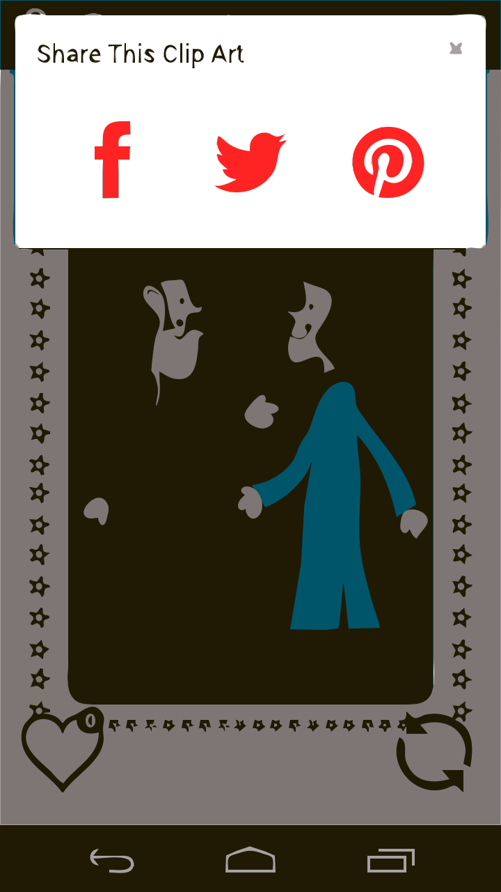 This is a cell phone screen displaying an artwork of two people. One person appears to be walking away from the other, who seems to be looking at them. Above the image, there is a button that says "Share This Clip Art." Below the image, there are icons for Facebook and Pinterest, which can be used to share the artwork on these popular social networks. The cell phone screen also has a heart icon in the bottom left corner, possibly indicating a favorite or love for the clip art.