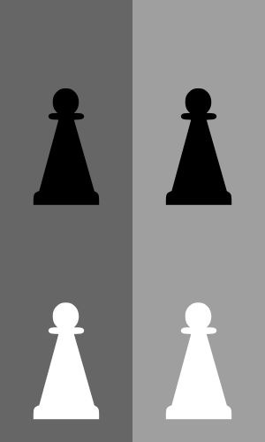This features a gray and white color scheme, with two black and white chess pieces prominently displayed. One of the chess pieces is positioned on the left side of the image, while the other is located in the center. These chess pieces are depicted as simple geometric shapes rather than detailed representations of actual chess pieces. The gray background provides a clean and minimalistic appearance to the image, allowing the viewer to focus solely on the two black and white chess pieces.