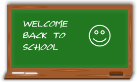 This features a green chalkboard with wooden frame, which has been used to write a message welcoming the children back to school. The message is written in white chalk and includes a smiley face, adding a cheerful touch to the greeting. The chalkboard appears to be placed on top of a desk or table, making it an ideal tool for conveying messages or reminders to students or colleagues.