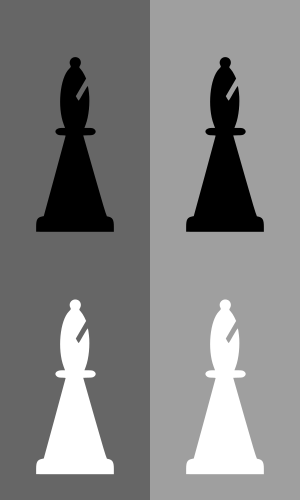This features a series of four chess pieces, each in different colors and placed on top of a checkered background. The chess pieces are arranged in two rows, with one row consisting of three black chess pieces and the other row containing one white piece. Each chess piece is distinctly colored, making it easy to identify their individual positions within the game board. The arrangement of these chess pieces creates an interesting visual effect that highlights each piece's unique appearance while maintaining a cohesive design throughout the image.