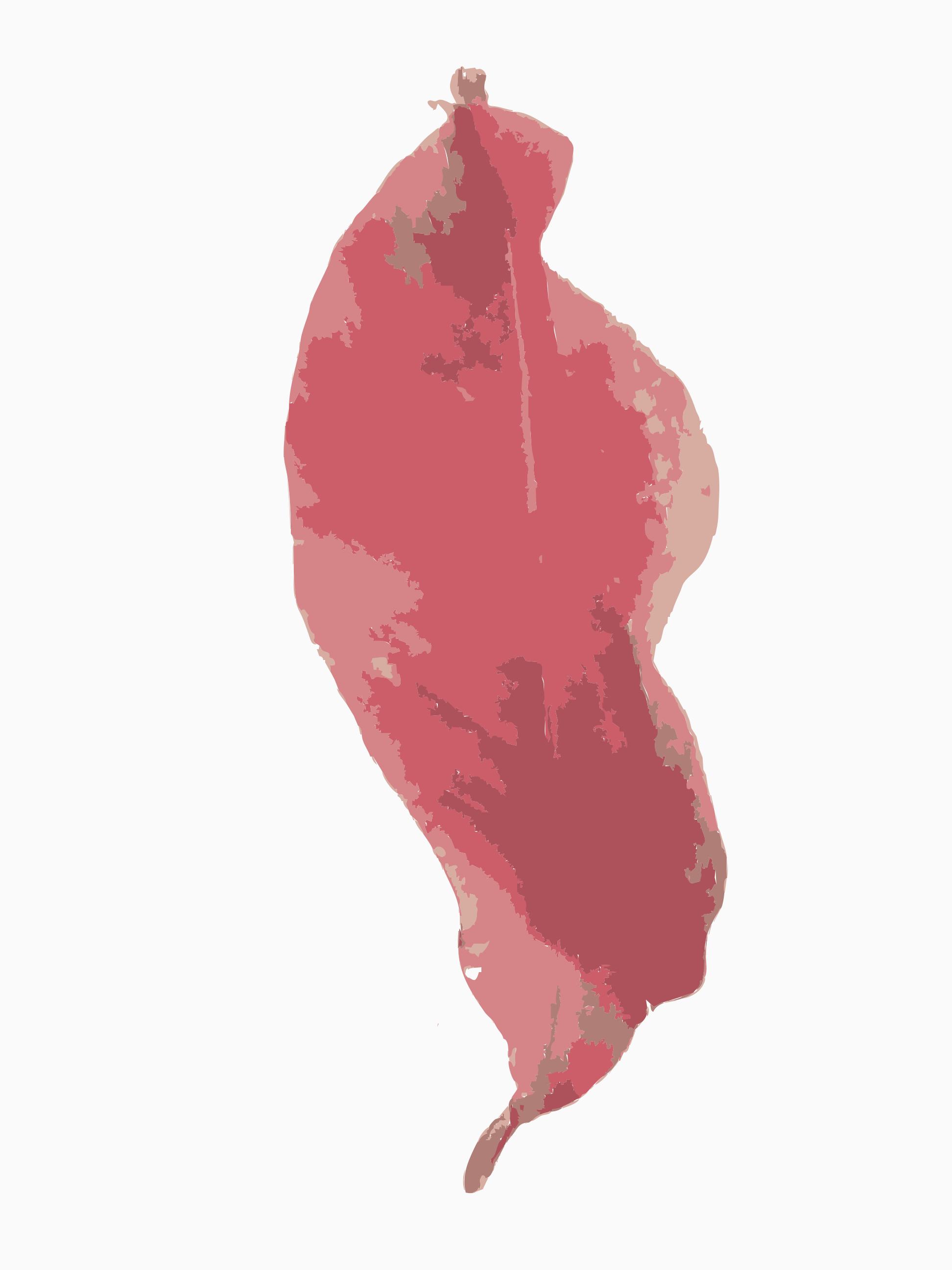 This features a red leaf, possibly a maple leaf, hanging from the top of a stem. It is positioned in the center of the frame and appears to be the main focus of the photo. The leaf has a slightly faded appearance, giving it an aged or vintage look. The overall scene seems to be set against a white background, which further emphasizes the red color of the leaf.