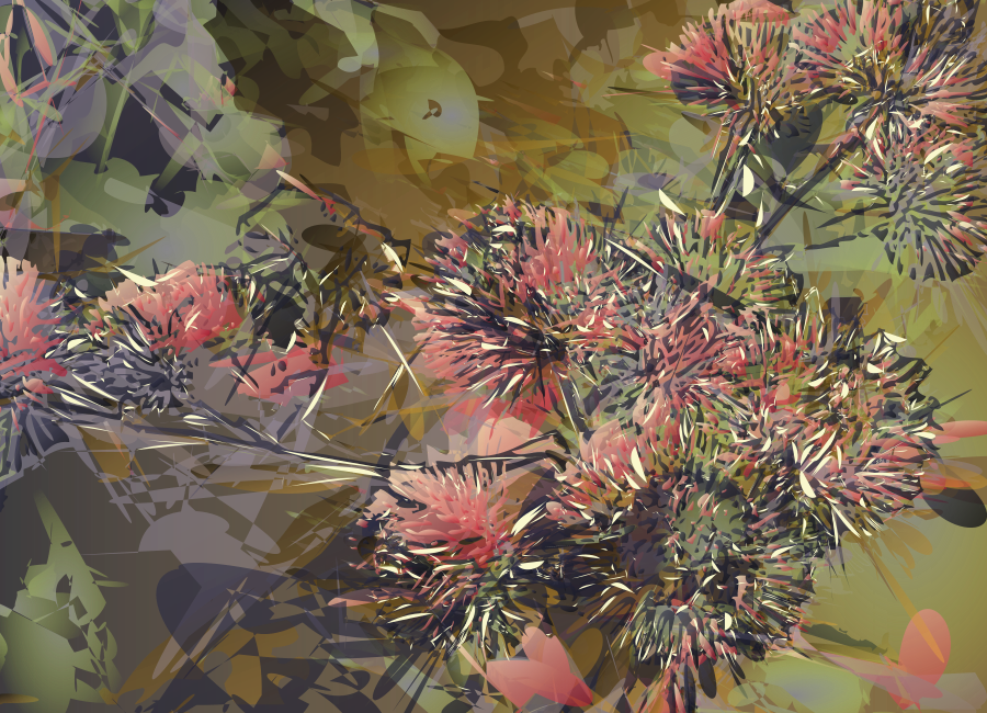 This features a close-up of a group of thistle flowers, with their distinctive purple and pink colors. These flowers are arranged in various positions, creating an interesting visual effect. Some of the flowers are located towards the top left corner of the image, while others can be found scattered throughout the scene. The overall composition of the image showcases the beauty of these thistle flowers against a backdrop that includes some greenery and possibly a leafy plant.