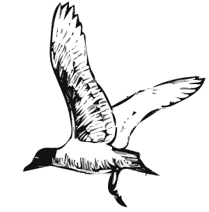 This features a black and white drawing of a bird, possibly a seagull or a similar species. The bird is captured in mid-flight with its wings spread wide, showcasing the intricate details of its feathers. The bird's body occupies most of the frame, while its wings extend from the left side to almost the right edge of the image. The drawing has a vintage feel and appears to be an artistic representation of the bird in action.
