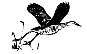 This features a black and white drawing of a bird, possibly a goose or a duck, flying through the air. It appears to be captured in mid-flight as it soars above some grassy terrain. The bird's wings are spread out, showcasing its impressive size and graceful movement. The scene is reminiscent of a painting, with the bird being the main focus and the surrounding environment providing context for its flight.