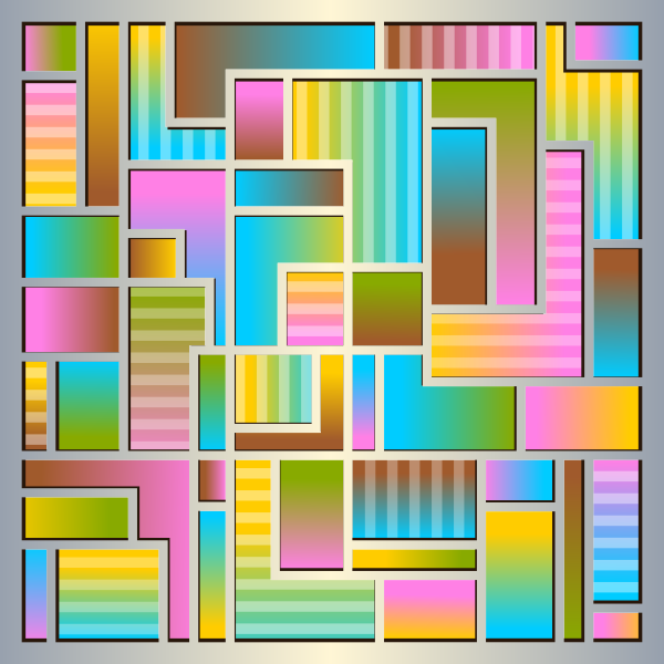 This is a colorful and intricate mosaic made up of various shapes, including squares and rectangles. These shapes are arranged in a visually appealing manner, creating an artistic pattern that covers the entire frame. The colors used in this mosaic are vibrant and diverse, with shades of pink, yellow, blue, green, orange, and brown all being represented. This unique design showcases the artist's skill in combining different shapes and colors to create a captivating visual experience.