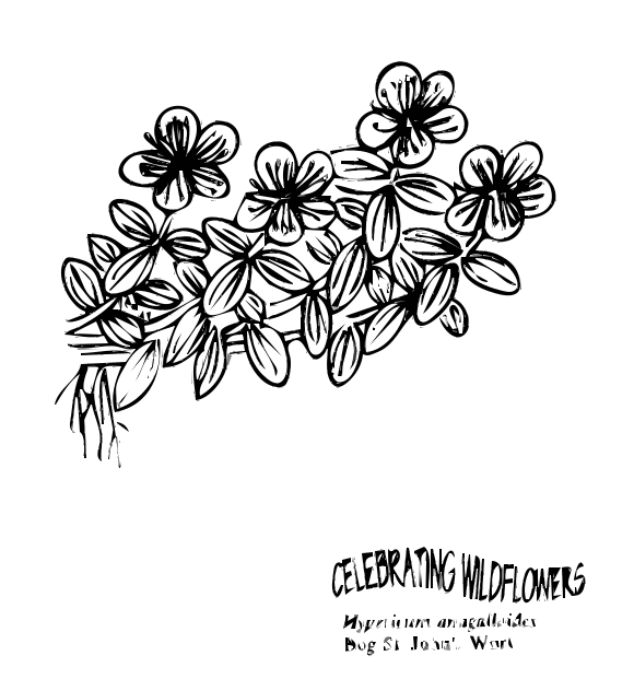 This features a black and white drawing of wildflowers, specifically Bog St. John's Wort or Hypericum anagalloides. This plant is native to the Northwest region of the United States and can be found in various habitats such as wetlands, meadows, and open woodlands. The drawing showcases the beauty of these flowers with their distinctive features like petals and leaves. The image also includes a caption that reads "Celebrating Wildflowers," which suggests that this artwork is meant to evoke feelings of joy and appreciation for nature's bounty. The artist has captured the essence of these flowers in their drawing, making it an appealing piece of art for anyone who loves wildflowers or enjoys the beauty of nature.