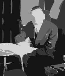 This is a black and white photograph of a man sitting at a table. He appears to be wearing a suit, tie, and glasses. The man's face is partially obscured by the shadow of his head on the table in front of him. The scene gives off an impression of a vintage or classic atmosphere.