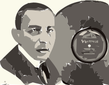 This features a man wearing a suit and tie, standing in front of an old record album. He appears to be the main subject of the photo, with his face prominently displayed on the left side of the frame. The man is looking off into the distance, possibly contemplating something or lost in thought. The record album itself takes up a significant portion of the image, covering most of the right side from top to bottom. It appears to be an old-fashioned vinyl record, adding a nostalgic touch to the scene. The combination of the man and the record album creates a sense of history and timelessness in this black and white photograph.