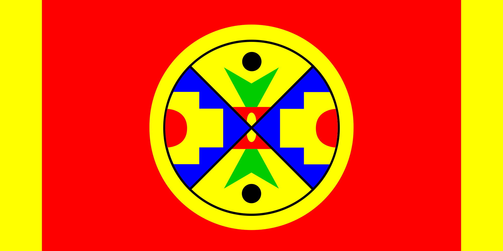 This features a red flag with a yellow and blue circle in the center. This circle is adorned with four green stars, each placed at different angles around its circumference. The flag appears to be a symbol of unity or pride for a particular group or organization. The colors used on this flag are bold and eye-catching, making it an attractive focal point in the image.