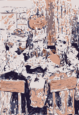 This is a black and white photo of a group of people sitting around a dining table. There are five individuals in the scene, with one person on each side of the table and two others seated at opposite ends. They appear to be enjoying a meal together, as there are multiple cups placed on the table. The atmosphere seems to be festive, possibly for Halloween, as indicated by the presence of pumpkins in the scene. The overall composition of the image is reminiscent of an old photograph, giving it a nostalgic feel.