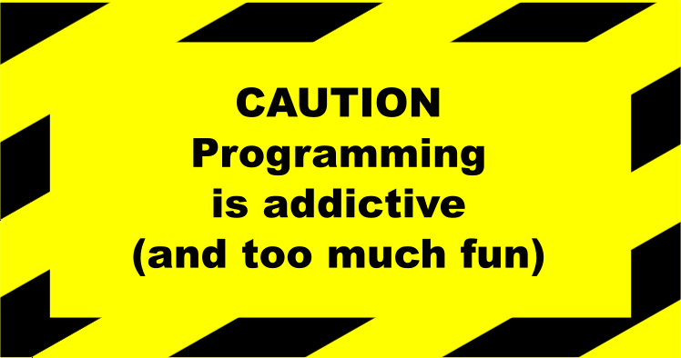 This features a yellow sign with black lettering that reads "Caution: Programming is addictive (and too much fun)". This sign seems to be a playful reminder of the potential dangers associated with programming, as it can be quite addictive and enjoyable. The sign's message might resonate with many people who have experienced the allure of coding or computer-related activities, and may serve as a warning for those who are new to these fields.