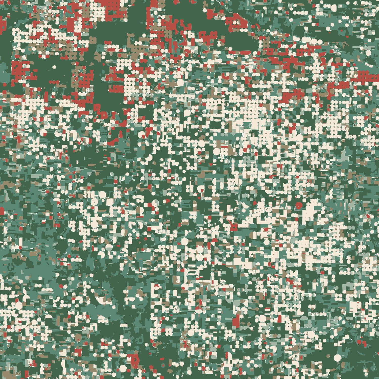 This is a close-up of a green and red checkered pattern, possibly resembling a map or a painting. The colors are predominantly green and red, with some white spots scattered throughout the scene. The pattern appears to be intricate and detailed, giving it an artistic quality. It's difficult to determine if this is a real image of a map or just a creative representation of one. Overall, the image has a visually appealing and unique appearance.