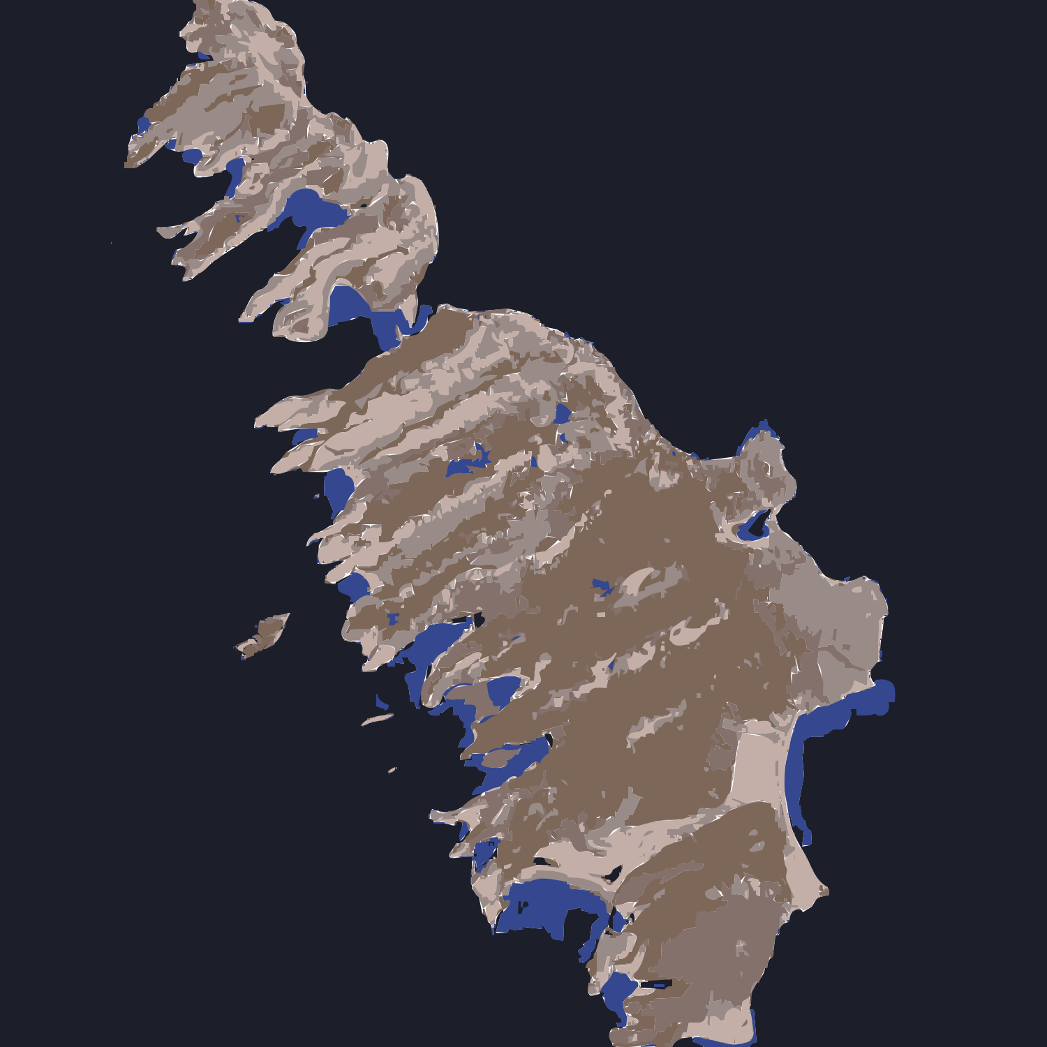 This is a map of the world, with various shades of blue representing different bodies of water. The land masses are depicted in brown and tan tones, giving the impression that it's an old or faded photograph. The map features a large island in the middle, surrounded by smaller islands scattered throughout the ocean. The overall effect is a stunning representation of our planet, with the blue waters contrasting beautifully against the earthy land masses.