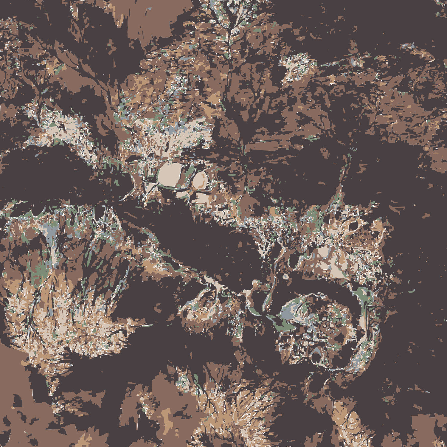 This is a close-up of an artistic, textured photograph that appears to be a painting or drawing. It features a variety of shapes and colors, creating a visually interesting composition. The main focus of the image seems to be on the center, where a large, round shape stands out against the surrounding elements. This central element is surrounded by smaller, more intricate shapes that add depth and complexity to the overall scene. The artistic nature of the photograph suggests it may have been created for display or as a piece of visual art rather than being a representation of an actual landscape.