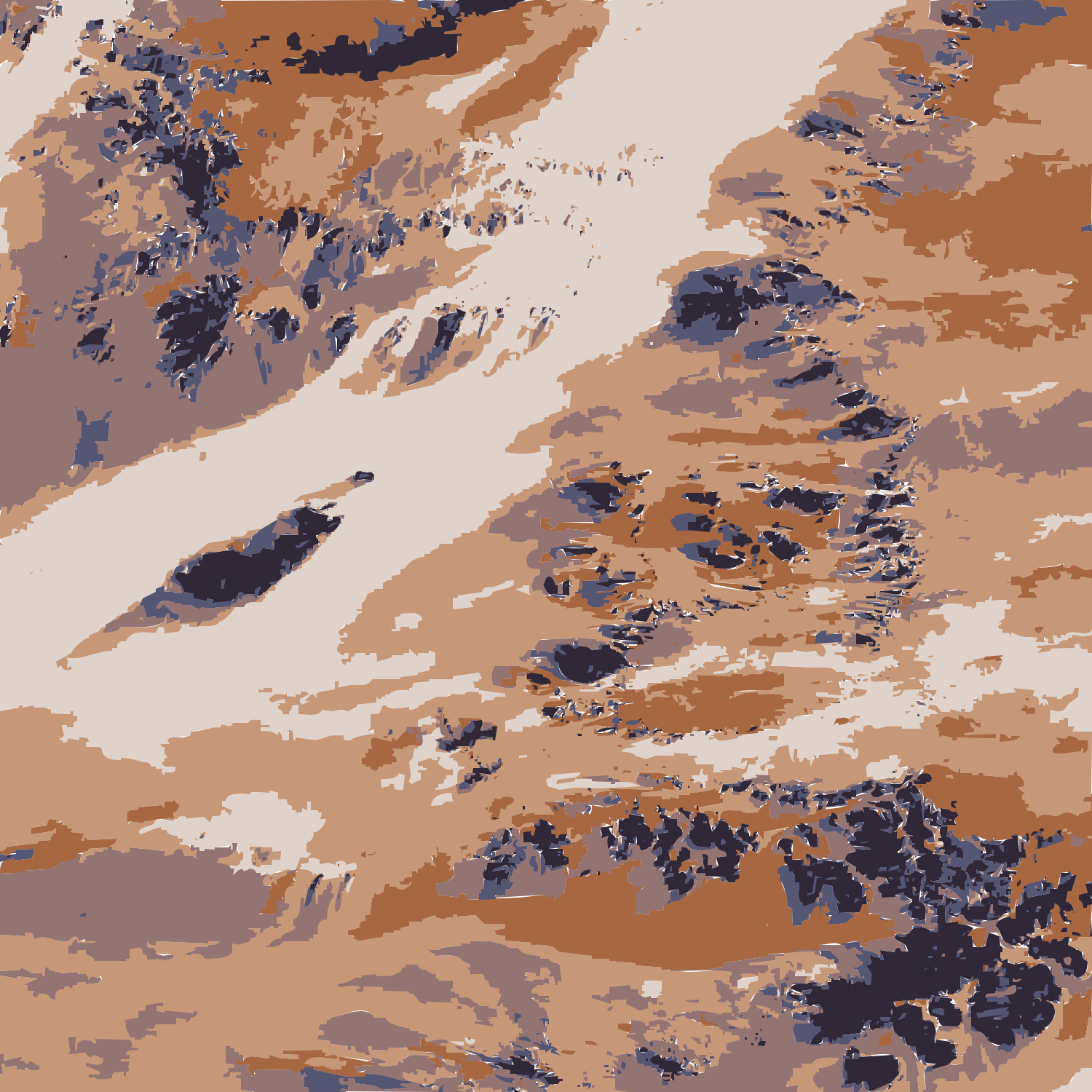 This is a beautifully detailed landscape of mountains and valleys, with the terrain appearing to be made up of various shades of brown. The mountains are covered in a mix of light and dark colors, creating an interesting contrast against the sky. There are several small hills visible throughout the scene, adding depth and complexity to the overall composition. The image is presented in a sepia tone, which adds a sense of nostalgia and timelessness to the landscape. The mountains appear to be covered with snow, giving them an icy appearance that contrasts nicely against the warm tones of the terrain. Overall, this stunning image captures the beauty of our planet's natural wonders in a unique and visually appealing way.