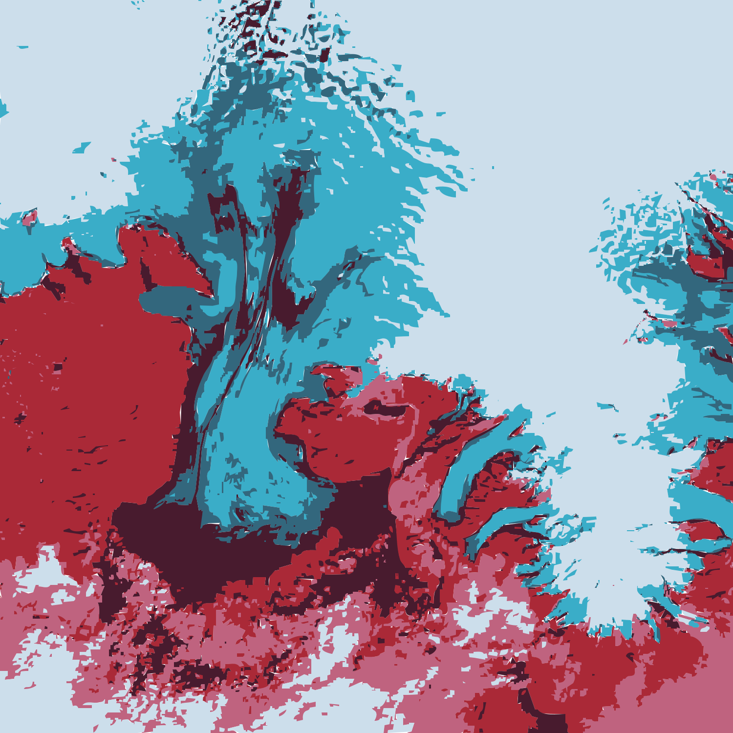 This is a colorful, abstract representation of the Earth. It features a mix of red and blue hues, creating an artistic and visually appealing scene. The colors are scattered throughout the image, with some areas appearing more vibrant than others. This unique perspective on our planet showcases its beauty in a creative way that stands out from traditional representations of Earth.