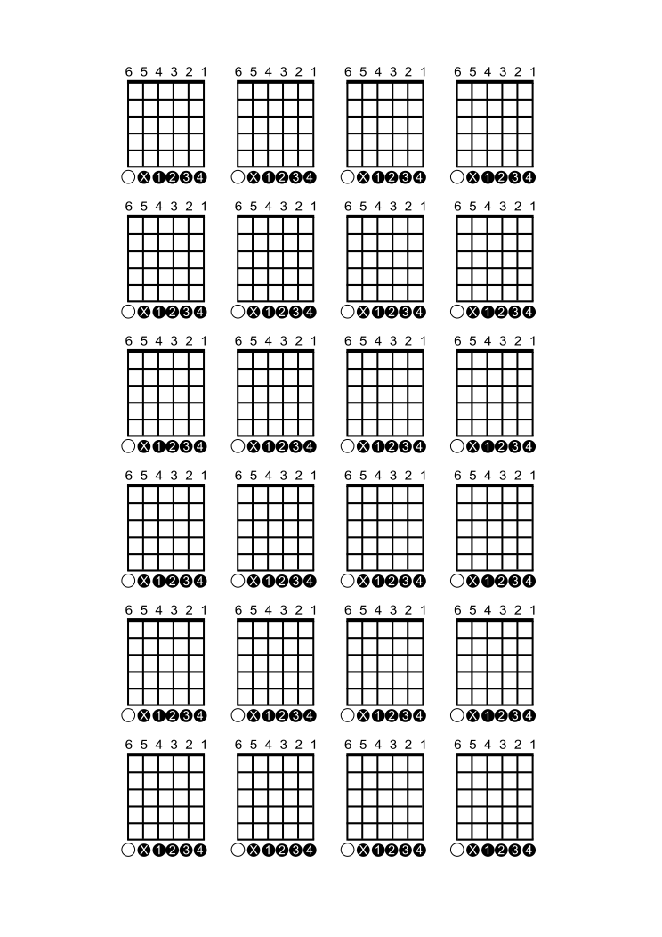 This features a collection of twenty-four guitar chord sheets, each one representing a different chord. These sheets are organized in a grid pattern and have black outlines surrounding the chords. This arrangement makes it easy for musicians to identify and practice the various chords on their guitars. The sheets are displayed in a visually appealing manner, with each sheet occupying its own space within the grid. Overall, this image provides an excellent resource for guitarists looking to improve their skills and learn new chords.