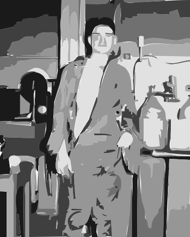 This is a black and white photo of a man standing in a room. He appears to be wearing a suit, possibly an old-fashioned one. In the background, there are several bottles placed on surfaces, with some near the top right corner and others scattered around the room. A chair can also be seen in the lower left part of the image. The man seems to be posing for the picture, giving a sense of history or nostalgia to the scene.