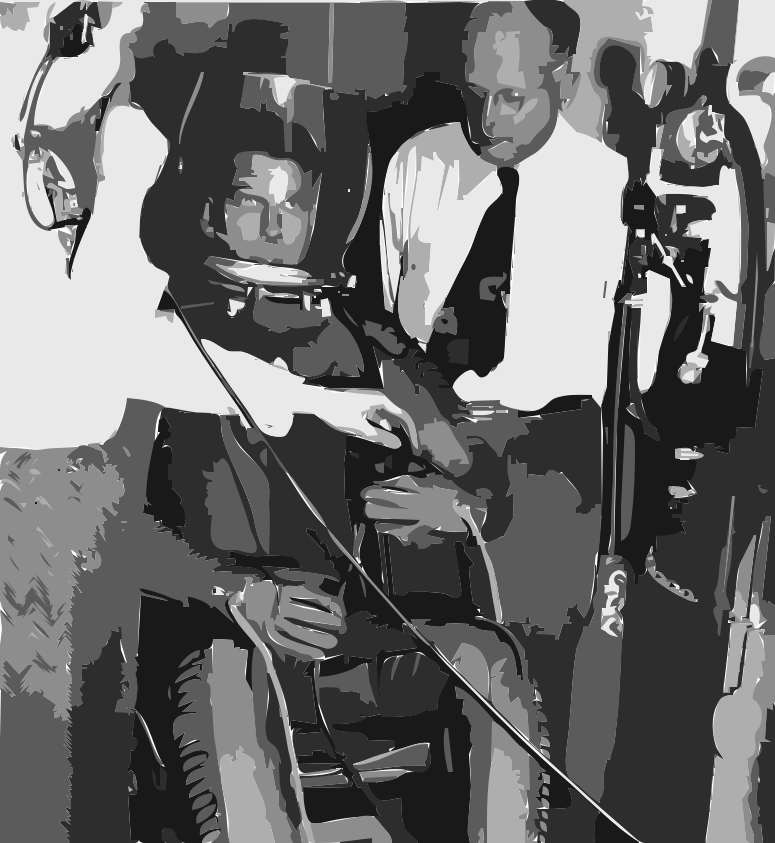 This is a black and white photo of a man wearing a space suit, sitting in a chair. He appears to be strapped into the chair with wires attached to his body. There are two men standing behind him, one on each side, who seem to be attending to the man in the space suit. The scene suggests that this could be related to an experiment or testing of some kind involving the space suit and its wearer.