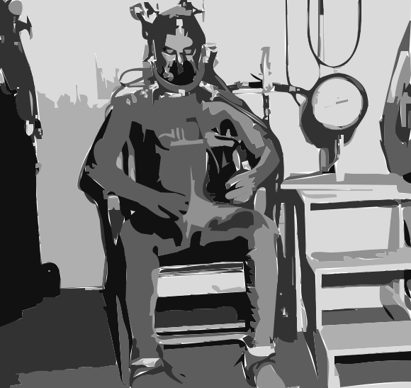 This features a man wearing a suit and sitting in a chair. He is holding an object, possibly a tool or a piece of equipment, in his hand. The scene appears to be set in a room with various objects around the space. There are two clocks visible on the wall, one near the top left corner and another towards the right side of the image. Additionally, there are three chairs in the room, one being occupied by the man wearing the suit, while the other two remain unoccupied. A book can also be seen placed on a surface within the room.