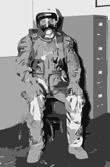 Tags: astronaut, finalfrontier, flight, flightsuit, nasa, pressuresuit, publicdomain, rocket, shuttle, space, vectorized, black and white, man in uniform, sitting down