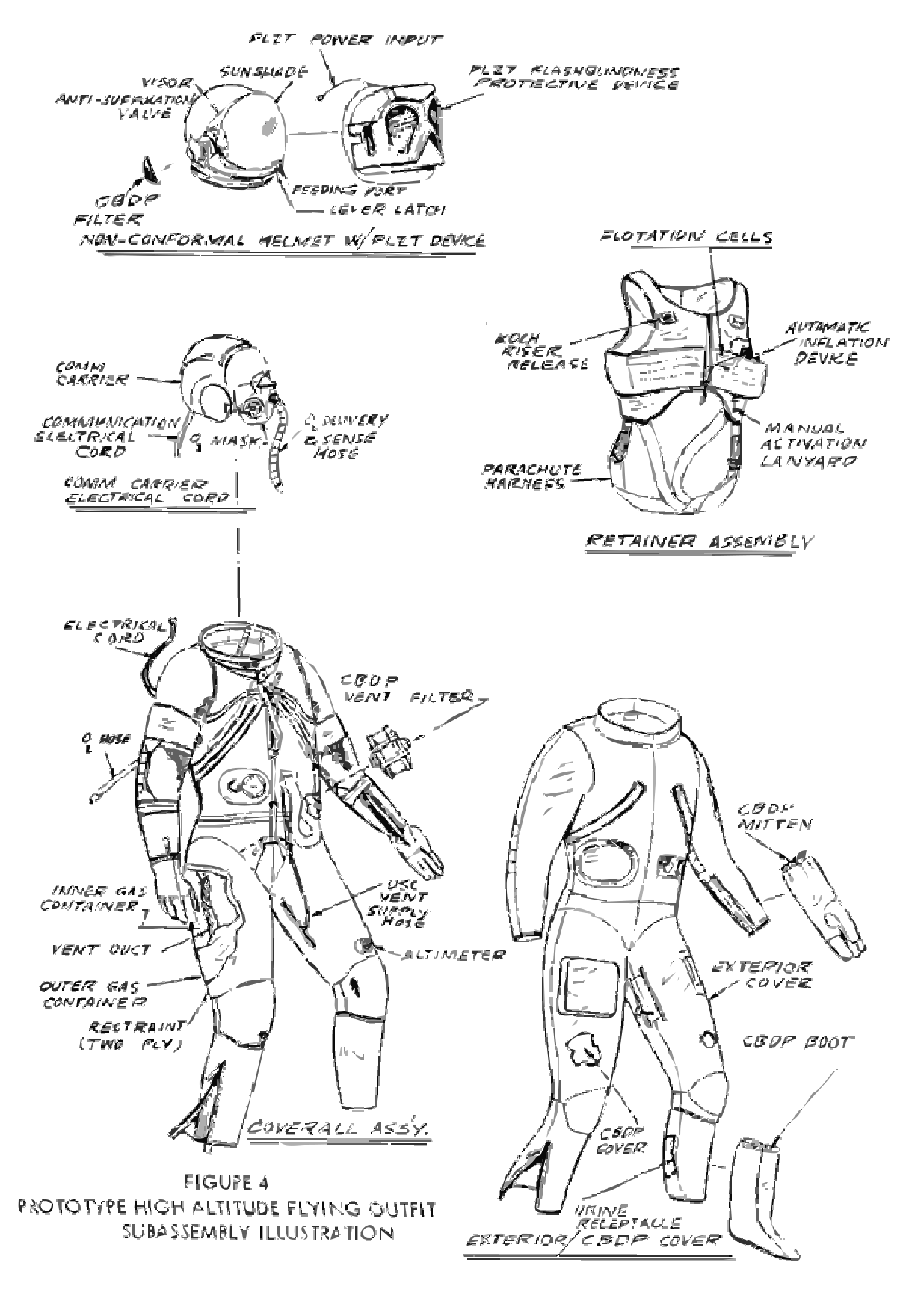 This is a collection of four diagrams, each depicting different aspects of space suits. These diagrams are accompanied by labels that provide information about the various components and features of the space suit. One diagram shows the inside of a space suit, while another displays its outer layer. A third diagram focuses on the helmet, and the fourth one is an illustration of the gloves worn with the suit. The diagrams are presented in a way that allows for easy understanding of the intricate details involved in creating a functional space suit.