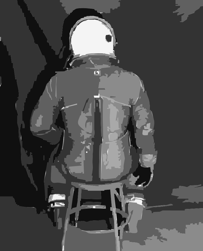 This features a person wearing a leather jacket and helmet, sitting on a stool. The individual appears to be dressed in a space suit, possibly for an event or performance. The scene is set against a backdrop of darkness, which adds to the dramatic atmosphere of the moment. The person's outfit suggests that they are prepared for an adventure or exploration, perhaps even on another planet.