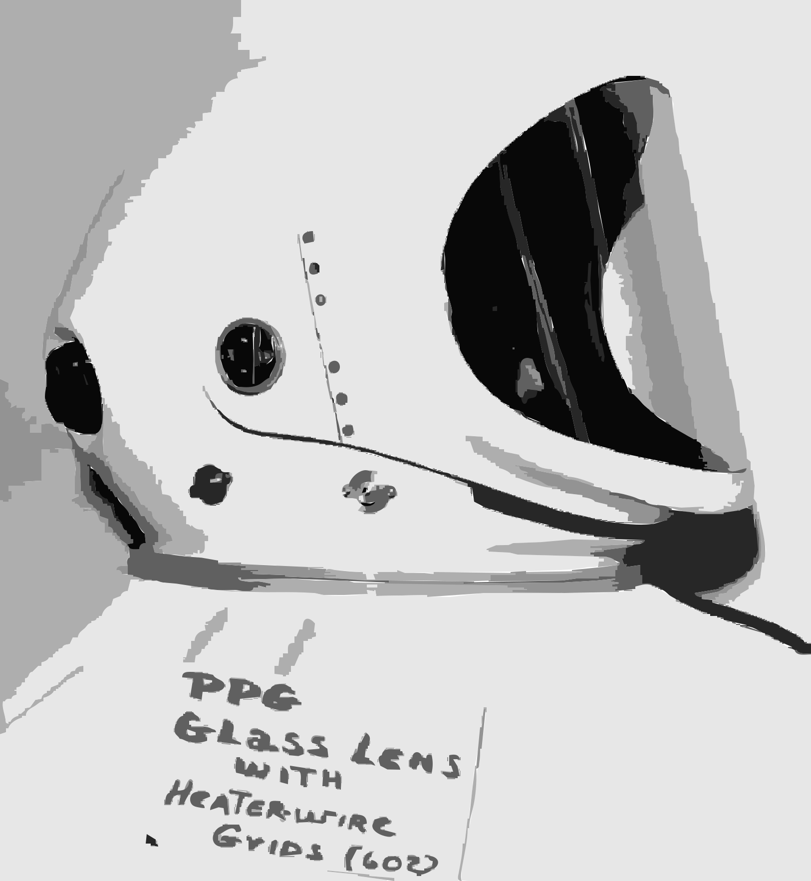 This is a black and white photo of a space suit helmet. The helmet appears to be made of glass, giving it a unique texture. The helmet has a visor that covers the face, making it difficult to see through. There are several small circles on the helmet, which could be used for ventilation or other purposes. The overall appearance of the helmet gives an impression of being old and possibly vintage in nature.