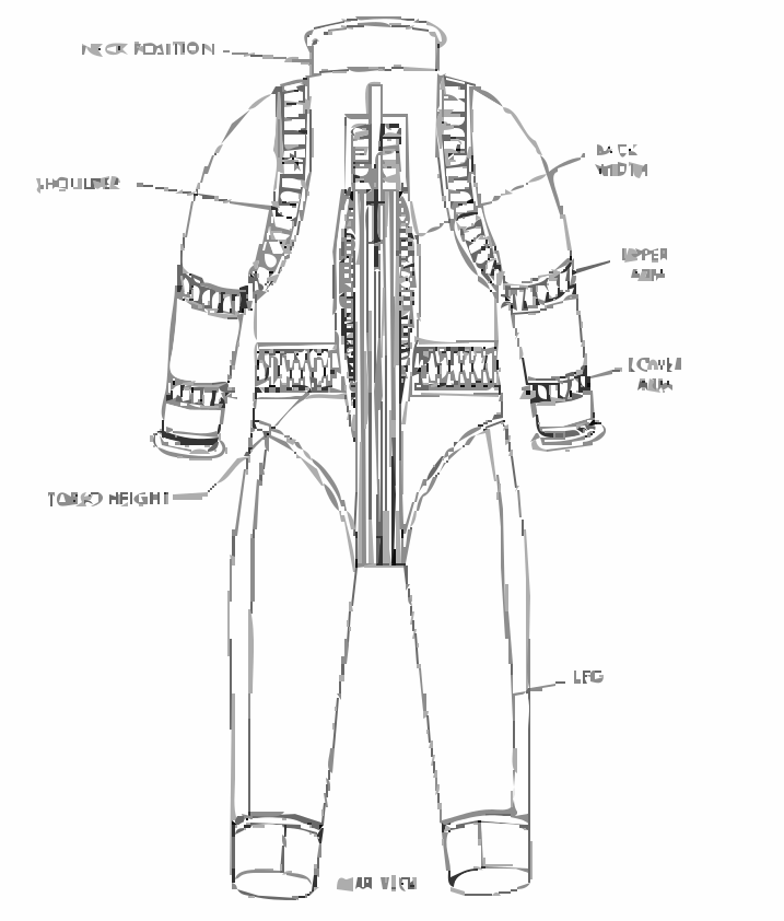 This is a detailed drawing of a suit, likely for an astronaut. It shows the various parts and measurements of the suit, including the neck, shoulders, chest, back, waist, hips, thighs, knees, shins, and feet. There are also labels indicating the different measurements and specifications for each part of the suit. The drawing is likely used as a reference or guide for creating an actual space suit.