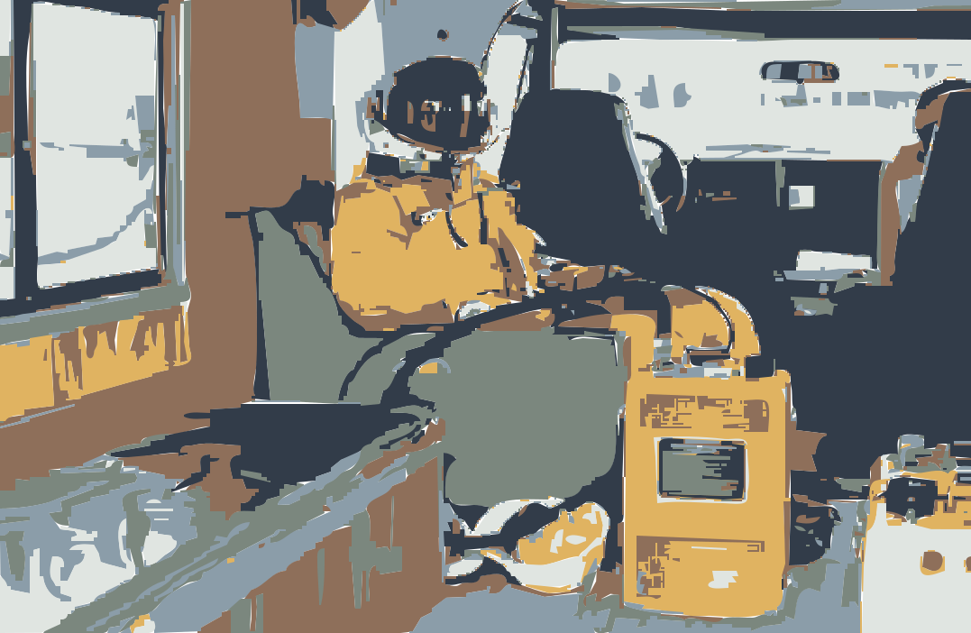 This features a man sitting in the driver's seat of a vehicle, possibly a space shuttle. He is wearing a yellow suit and appears to be preparing for an important mission or task. There are several chairs visible around him, with one located near his left side and another further back on the right side. A dining table can also be seen in the background, along with a bottle placed nearby. The scene gives off a sense of anticipation as the man is ready to embark on his journey.