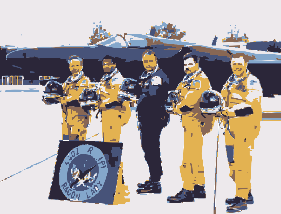 This features a group of men standing on an airfield, all wearing yellow jumpsuits. They are posing for the camera and appear to be pilots or members of a space team. There are five people in total, with some standing closer together while others maintain a bit more distance from one another. In addition to their uniforms, each person is holding a helmet, which suggests that they may be preparing for an important mission or training exercise. The scene captures the camaraderie and teamwork among these individuals as they stand ready for their next adventure.