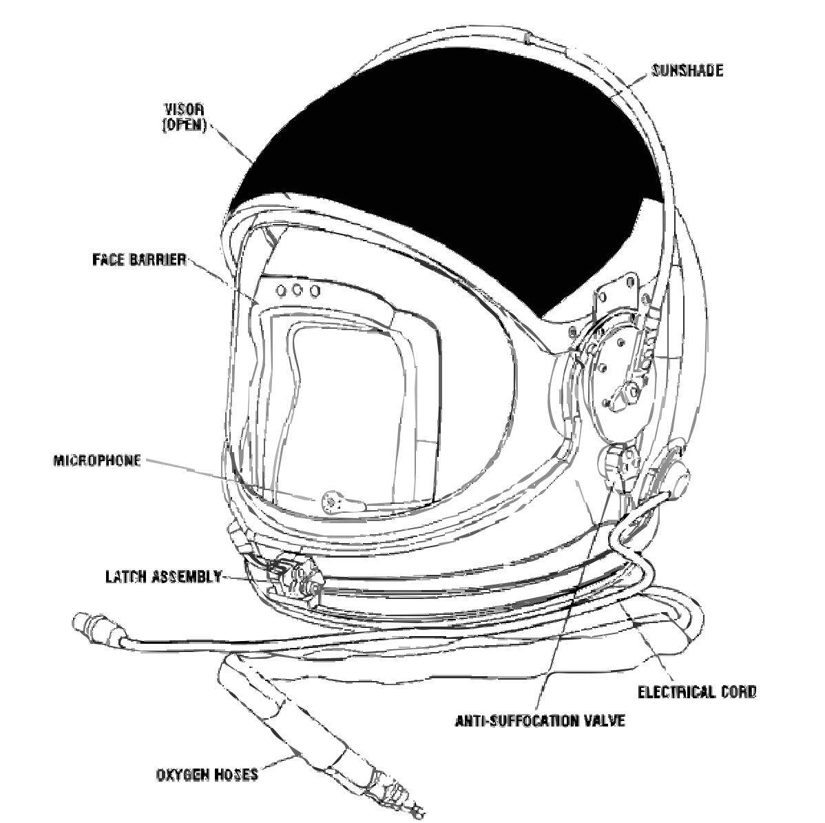 This is a diagram of a space suit, specifically focusing on the helmet. It shows various parts and components of the helmet, including the face barrier, microphone, oxygen mask, anti-suffocation valve, electrical cord, and more. The diagram provides detailed information about each part and its function within the helmet. This type of illustration is useful for understanding the design and purpose of a space suit's protective gear.