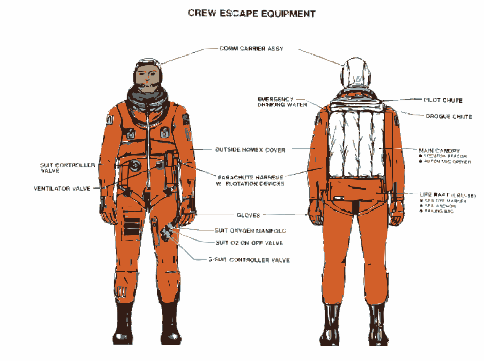 This is a diagram of an orange space suit with various labels describing the different parts and functions. The suit appears to be designed for use in outer space, as indicated by its labeling. The diagram shows that the suit includes a helmet, gloves, boots, and other essential components. Additionally, there are several labels indicating the suit's designation, such as "crew escape equipment" and "extravehicular activity." This suggests that the suit is designed for use in space exploration or rescue missions. The diagram provides a detailed view of the various parts of the suit, allowing for a better understanding of its structure and purpose.