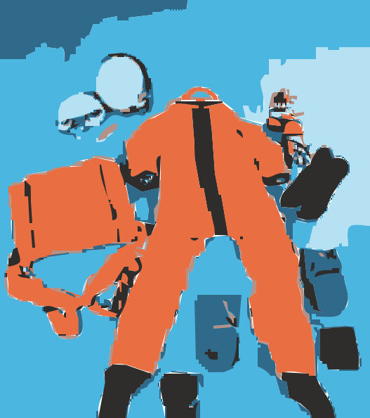 This features a person wearing an orange jumpsuit, standing in front of various pieces of luggage. There are two suitcases on the left side and one on the right side of the person. Additionally, there is a backpack located near the center of the scene. A helmet can be seen placed above the person's head, possibly indicating that they are preparing for an adventure or exploration. The overall atmosphere suggests that this could be a space suit or a specialized outfit designed for travel to high altitudes or challenging environments.
