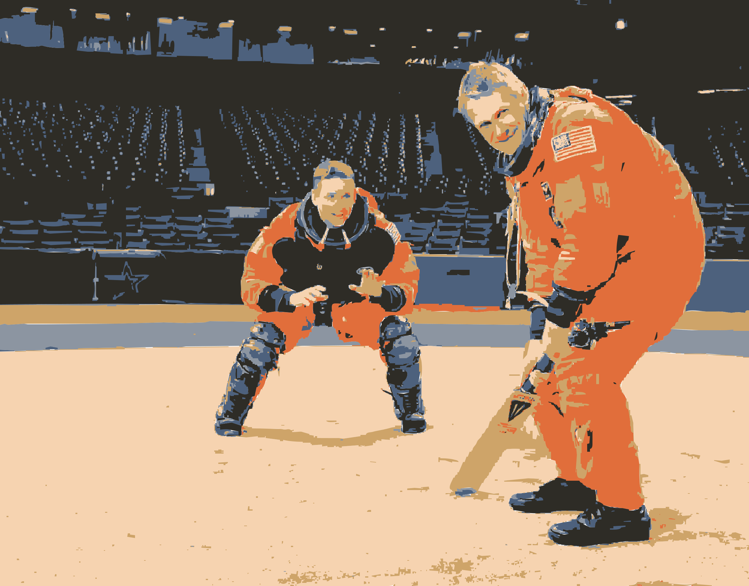 This features two men dressed in orange space suits, standing on a field. One of the men is holding a baseball bat while the other has his hands behind him. They appear to be posing for a picture or participating in an event related to space exploration and sports. The scene seems to be set up with chairs placed around the area, possibly for spectators or participants.