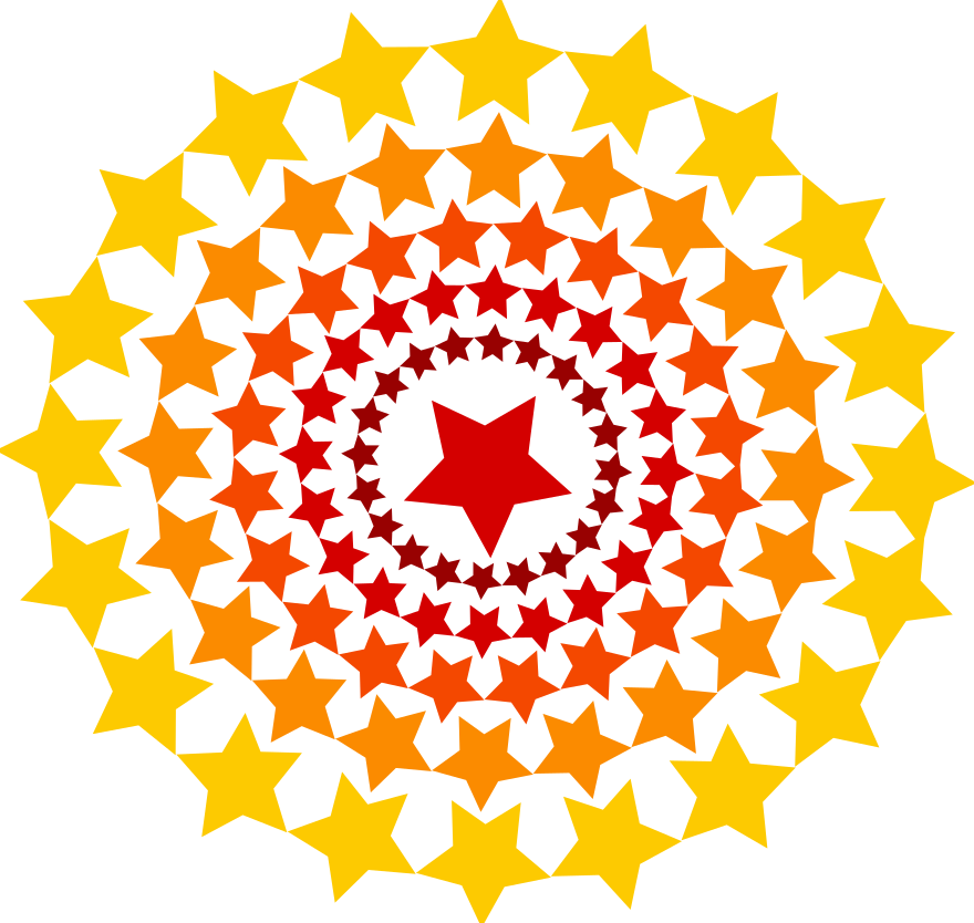 This features a large, colorful star pattern with various shades of yellow, orange, and red. The outermost ring is filled with the largest stars, while each inner ring contains smaller stars. The design creates an intricate and visually appealing pattern that resembles a kaleidoscope or a mandala. This artistic piece could be used as a decorative element in various settings such as homes, offices, or events, adding a touch of vibrancy and creativity to the space.