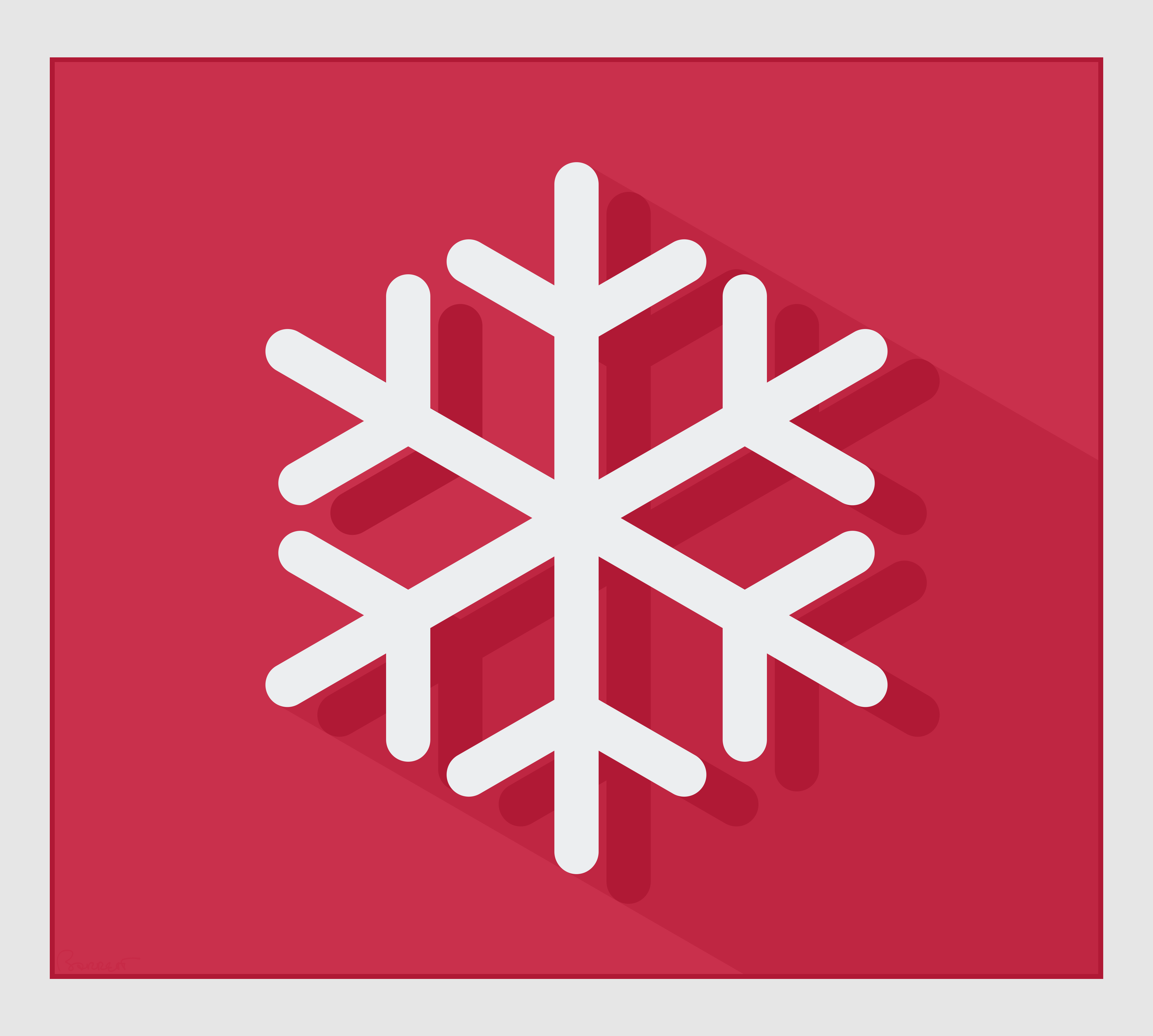 This features a red background with a white snowflake design. The snowflake is the main focus of the image, and it appears to be a modern interpretation of the classic winter symbol. The snowflake has a slightly abstract appearance, giving it a unique and contemporary look. The red background provides a striking contrast against the white snowflake, making it stand out even more prominently in the scene. Overall, this image presents an interesting take on a traditional winter motif.