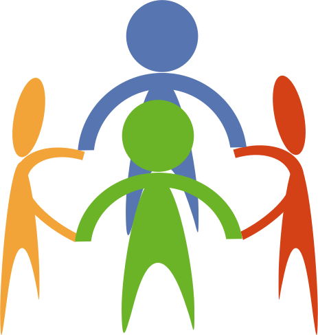 This features a group of four people standing together, each person is made up of simple shapes and different colors. They are all holding hands, creating an impression of unity and togetherness. Each individual is distinctly colored: red, green, yellow, and blue. These colorful figures are arranged in such a way that they form a circle, with the people's arms intertwined to create a sense of connection among them. The image conveys a message of friendship, love, or camaraderie through its use of simple shapes and vibrant colors.