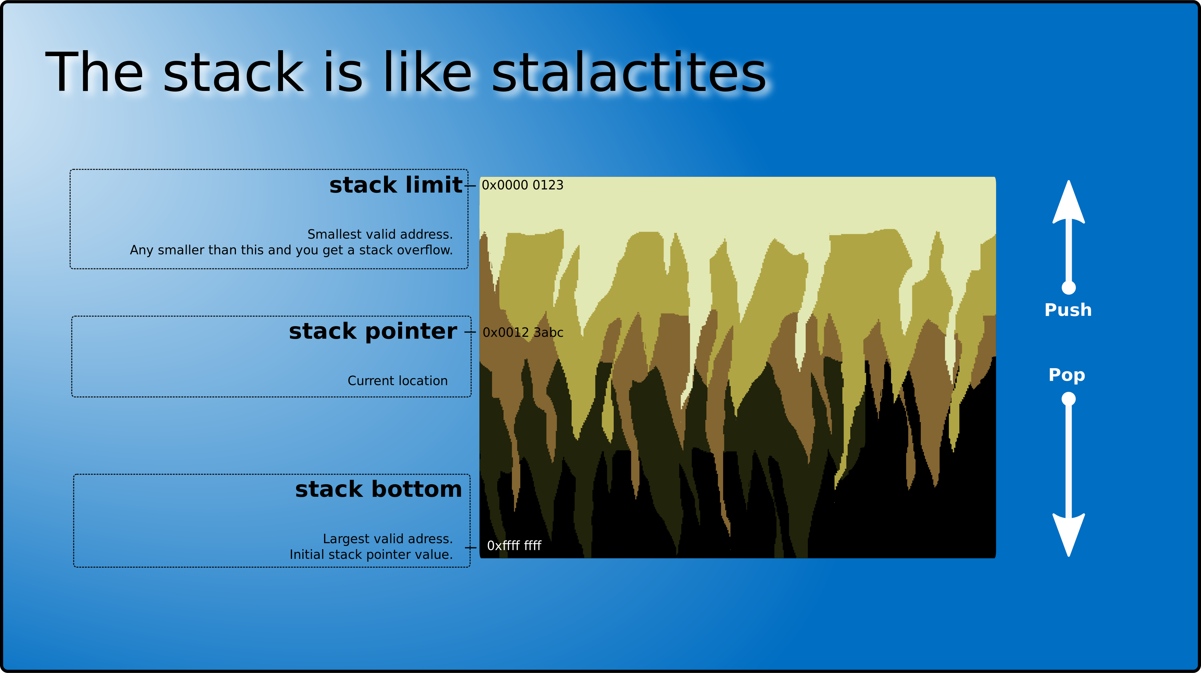 Tags: assembly, c, c , explanation, illustration, programming, stack, like stack, stack limit, stack pointer, stack top, stack bottom.