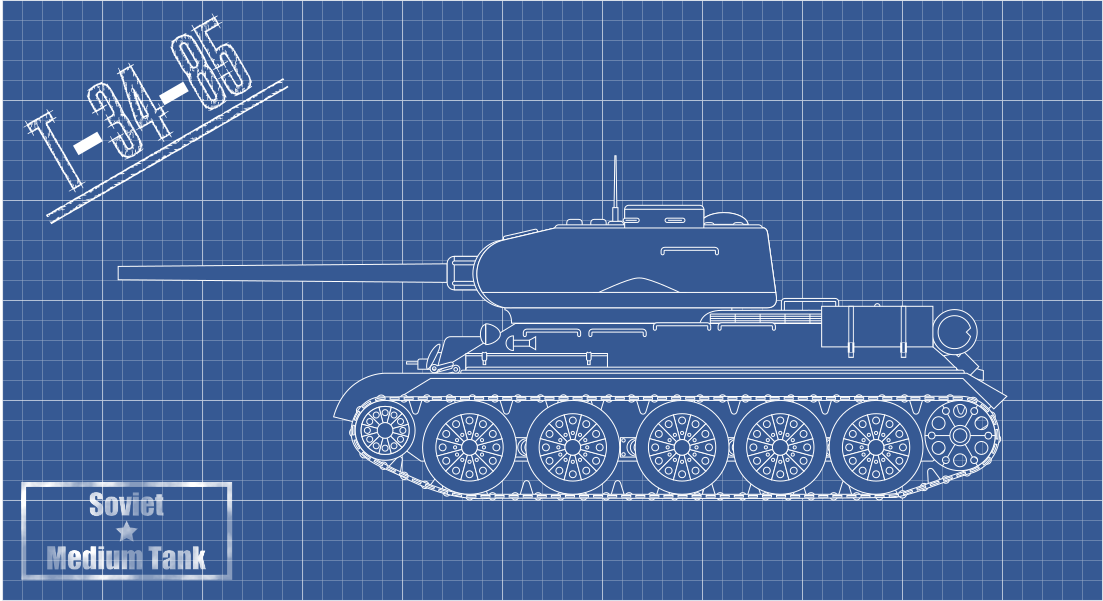 This is a blueprint of a Soviet medium tank T-34-85 from the WW2. It features a large, detailed drawing of the tank with various parts labeled for reference. The tank has a prominent turret and multiple wheels on its sides, indicating it's a well-equipped military vehicle. The blueprint is displayed in a grid pattern, which helps to emphasize the different components of the tank. Overall, this image provides an excellent visual representation of the T-34-85 tank for those interested in military history or engineering.