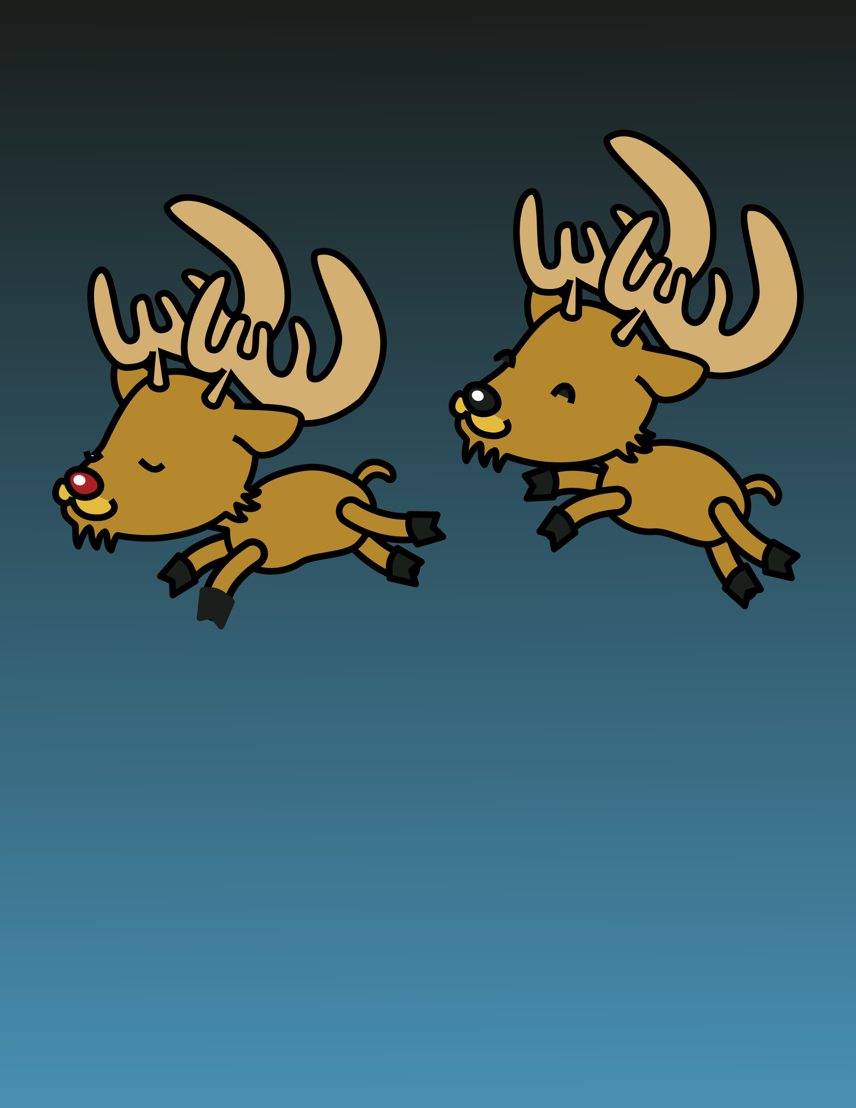 This features two cartoon reindeer flying in the air. They are both wearing antlers and have a playful expression on their faces, giving them a cute appearance. One of the reindeer is positioned slightly higher than the other, creating an illusion of depth as they soar through the sky. The scene appears to be set against a dark background, which further emphasizes the contrast between the reindeer and their surroundings.