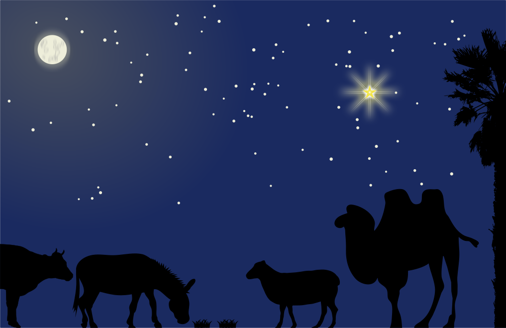 Tags: ass, bethlehem, camel, christmas, cow, donkey, manger, moon, nativity, palm tree, sheep, sky, star, xmas