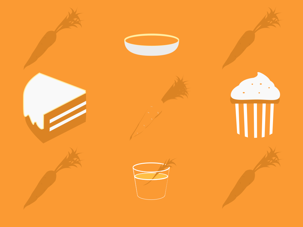 This features a variety of food items, including cakes and carrots. There are four different types of treats made out of carrot: carrot cake, carrot juice, carrot pie, and carrot ice cream. These items are displayed in an orange background, which adds to the visual appeal of the image. The cakes are placed at various positions within the frame, with one on the left side, another in the middle, and two more towards the right side. The carrots can be seen scattered throughout the scene, with some closer to the top-left corner, others near the center, and a few more towards the bottom-right area of the image. Overall, this image showcases an assortment of delicious food items made from carrots, inviting viewers to indulge in these healthy treats.